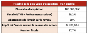 Sa plus-value d’acquisition sera donc imposée aux prélèvements sociaux de 17,20% et à l’impôt sur le revenu d’après sa tranche marginale d’imposition après abattement de 50%.