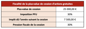 Monsieur Patrimoine s’étant renseigné sur les conditions d’acquisition de ses actions gratuites, il souhaite procéder à leur vente. La valeur des actions cédées est de 125 000€.