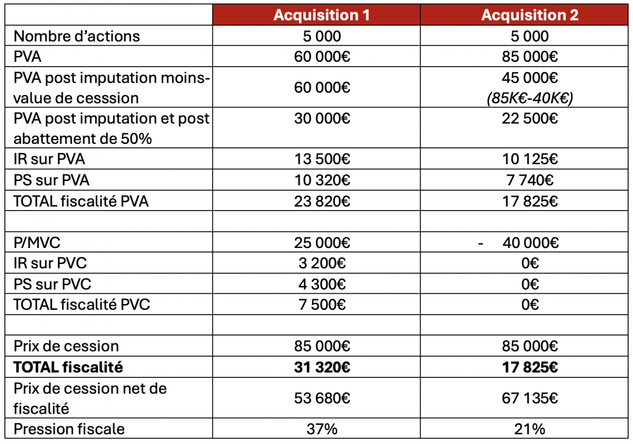 Ce cas met en lumière l’impact significatif de l’imputation des moins-values de cession sur la pression fiscale. Lors d’une cession contrainte ou si le cours de l’action est inférieur au prix d’acquisition, le choix des actions à céder peut influencer fortement la fiscalité.