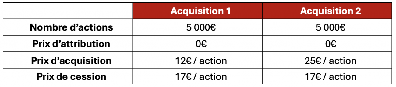 La plus-value d’acquisition correspond à la différence entre le prix d’acquisition et le prix d’attribution. Elle bénéficie d’un abattement de 50 % (régime Macron III) avant d’être imposée à la tranche marginale d’imposition. Toutefois, avant l’application de cet abattement, l’éventuelle moins-value de cession vient s’imputer sur la plus-value d’acquisition, réduisant ainsi la base taxable.