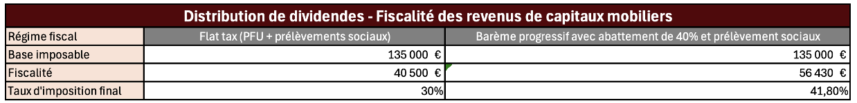 - Base imposable pour la distribution de dividendes : 135 000 €