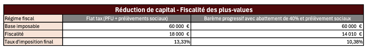 ✍️ Bilan : M. Patrimoine a économisé 26 490 € d’impôt grâce à la réduction de capital et à l’option globale pour barème progressif de l’impôt sur le revenu. Cela lui a ainsi permis de limiter son taux d’imposition final à 10,4% (contre 30% sur la distribution de dividendes).