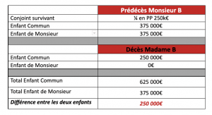 Nous remarquons l’inégalité qui s’est créée de 250 000€ en défaveur de l’enfant d’un premier lit. Monsieur B souhaite étudier les possibilités qui s’offrent à lui pour rétablir l’égalité dans sa succession peu importe l’ordre des décès.
