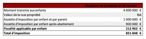 Au lieu de donner la maison et le terrain valorisé à 4 millions € et d’être imposé sur la totalité, M. et Mme Y ne vont transmettre que la nue-propriété valorisée à 2 millions €. La pleine propriété se reconstituera aux décès des parents en franchise de droits.