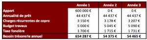 Pour ce projet le financement sera de 732 000 € sur 20ans à un taux de 2%, l’annualité sera donc de 44 000 €. Pour coller le plus possible à la réalité il faut aussi tenir compte des charges récurrentes de copropriété, d’un budget travaux et de la Taxe foncière.