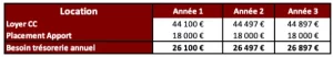 Le besoin de trésorerie évoluera peu car la réévaluation annuelle du loyer de 1% et la simulation de rentabilité de l’apport est constante.