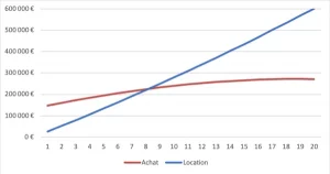Ainsi, on peut voir qu’au bout de 3ans la location aura couté 79 000 € et l’achat 173 000 €. On atteint un point d’équilibre à 8 ans. Au-delà de 8 ans, le choix de la location devient moins intéressant.