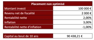 Madame Dupont, dispose de 100 000€ sur des livrets et ce qu’elle ne voit pas c’est que l’inflation grignote son rendement. En effet, l’équation est simple car avec une inflation à 3%, même le livret A qui rémunère 2% ne sera pas suffisant.
