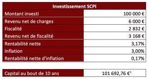 A titre d’exemple, nous pouvons préconiser à Madame DUPONT d’investir au travers d’une SCPI qui distribue un revenu net de frais de 6%.