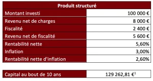 Dans sa situation, sélectionner un produit structuré qui délivrera un coupon de 8% net par an avec protection conditionnelle du capital, permettra à Madame DUPONT d’investir intelligemment sont argent et de surperformer face à l’inflation. Encore faut-il être bien accompagné sur ces sujets.