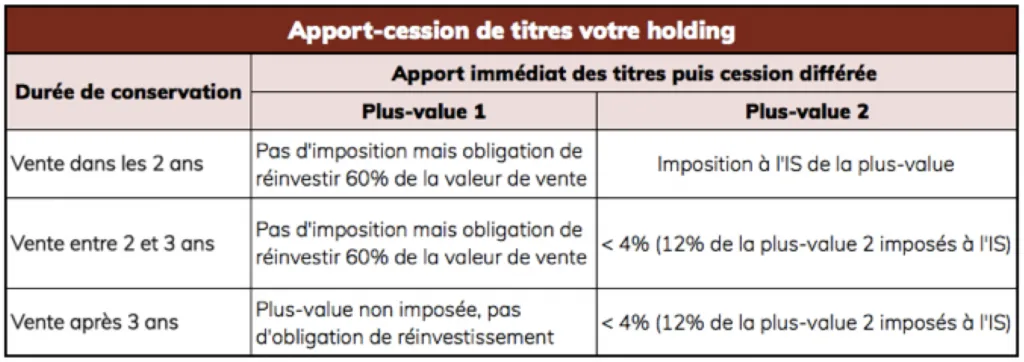 La première étape consiste à apporter les titres détenus en direct à une société à l’IS que l’apporteur contrôle. Cet impôt est donc placé en report si l’apporteur contrôle la Holding.