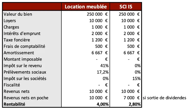 Si faire de la location meublée en SCI est possible, le cumul peut être difficilement réalisable. Vous trouverez ci-dessous une comparaison entre une location meublée (LMNP) en direct et en SCI (à l’IS) :
