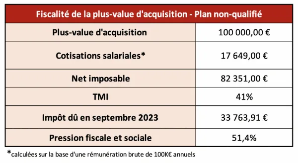 Dans tous les cas, dans le cadre des plan non qualifiés, il faudra prévoir un éventuel reliquat d’impôts à payer en septembre de l’année suivant l’acquisition dès lors que le prélèvement à la source opéré sur le bulletin de paie n’aura pas été suffisant pour solder la totalité de l’impôt dû.