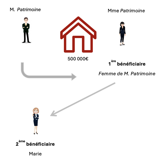 Monsieur Patrimoine a eu d’une première union, une fille, Marie. Quelques années plus tard, il s’est remarié avec Madame Patrimoine. Il souhaite donner sa maison à Madame Patrimoine pour qu’elle la transmette à Marie par la suite.