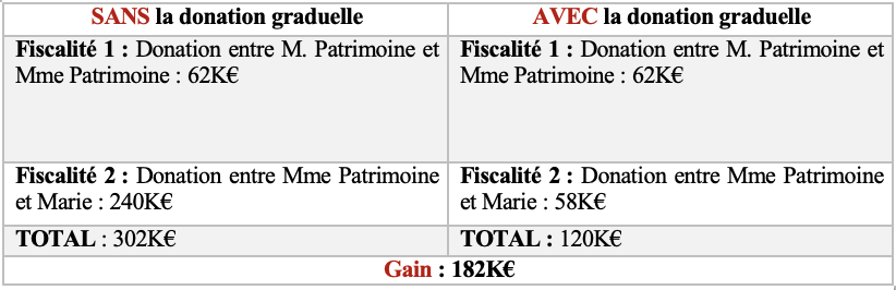 ➡️ Ainsi, pour répondre à l’objectif de Monsieur Patrimoine, la donation graduelle permet un gain fiscal de 182K€ sur un bien valorisé 500K€.