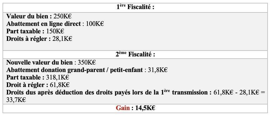 Dans cet exemple, la transmission sur plusieurs générations permet un gain sur les droits de transmission de plus de 14K€.