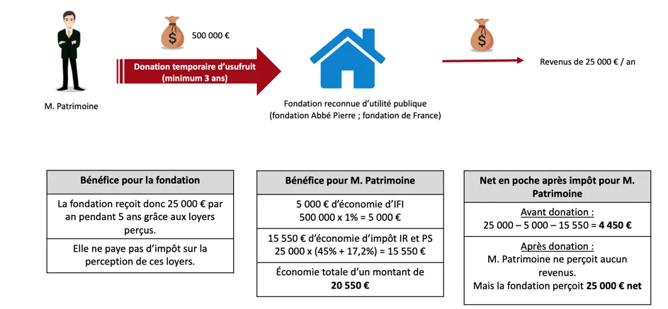 Nous préconisons à Monsieur Philanthrope d’effectuer une donation temporaire d’usufruit à la fondation de son choix de son vivant. Ainsi, il économisera une partie de son impôt sur la fortune immobilière ainsi que sur son imposition sur le revenu.